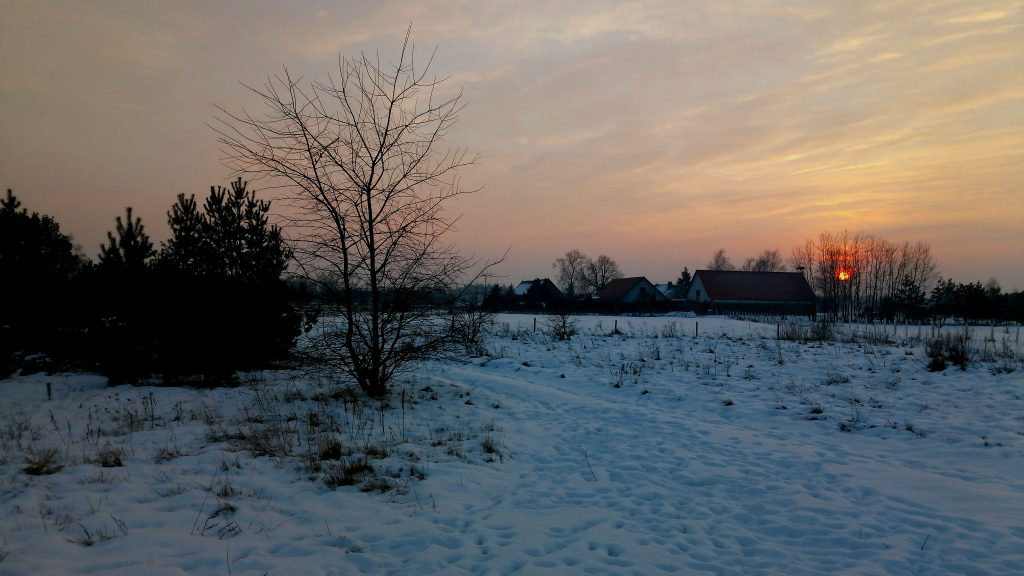 W tym roku pierwszy śnieg spadł dzień po tym, jak staliśmy się właścicielami kawałka wsi. Oczywiście zaraz po pracy zapakowaliśmy psa do samochodu i pojechaliśmy na naszą działkę. Szczerze? Spodziewaliśmy się, że będziemy musieli odbyć kilkusetmetrowy trekking przez zaspy, aby dostać się do naszej działki. Jakie było nasze zdziwienie, gdy okazało się, że polna droga dojazdowa jest odśnieżona! A obawialiśmy się, że na start będziemy musieli zainwestować w dobre 4×4 aby zimą stamtąd wyjechać.